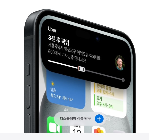 요긴한 각종 알림과 실시간 현황 정보를 그때그때 띄워주는 Dynamic Island. 덕분에 다른 일을 하는 중에도 놓치지 않고 한눈에 쉽게 확인할 수 있습니다.