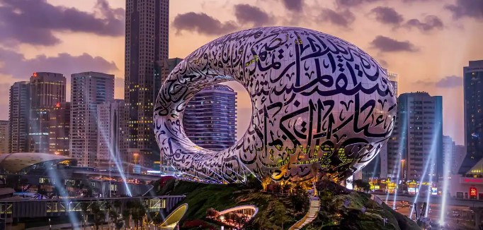 전 세계에서 가장 아름다운 건물 중 하나로 널리 알려진 미래 박물관(Museum of the Future)은 꼭 방문해야 하는 사진 촬영 명소입니다. 박물관에 들어가지 않아도 멋진 구도를 찾아 캘리그래피가 돋보이는 박물관의 인상적인 외관을 사진에 담을 수 있습니다.